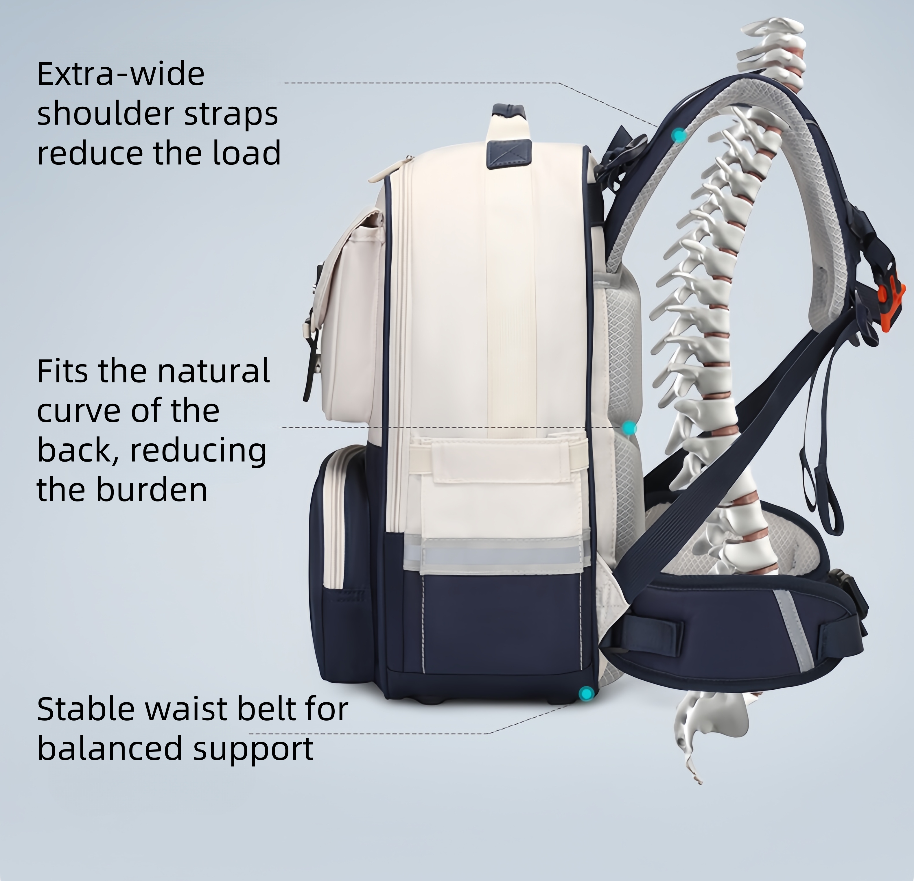 A truly ergonomic school bag is not just lightweight — it is carefully engineered to protect a child’s posture and reduce daily strain. Key criteria include: